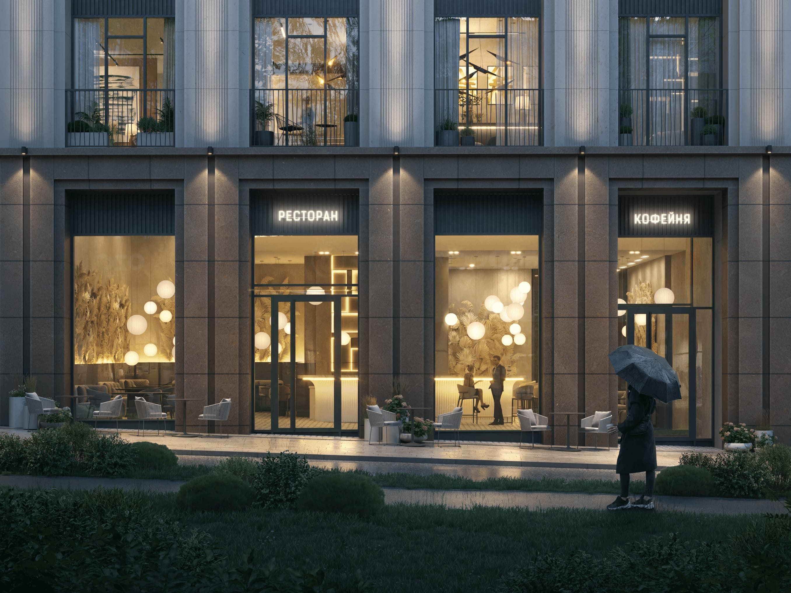 На первых этажах расположены магазины, кафе и другие городские сервисы.