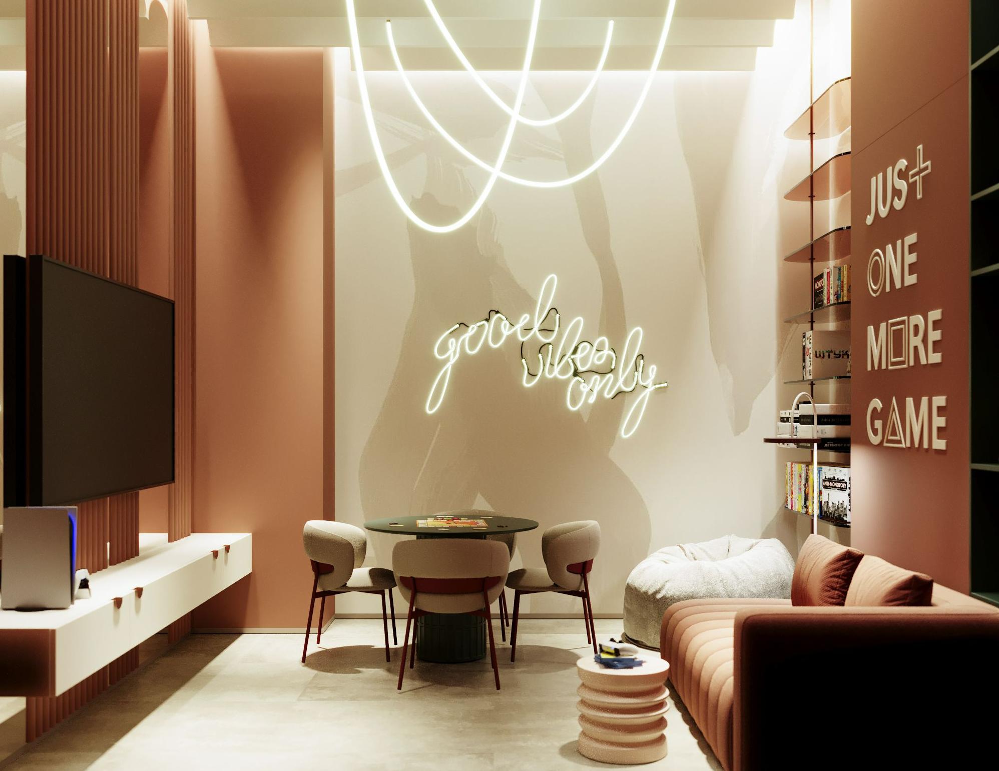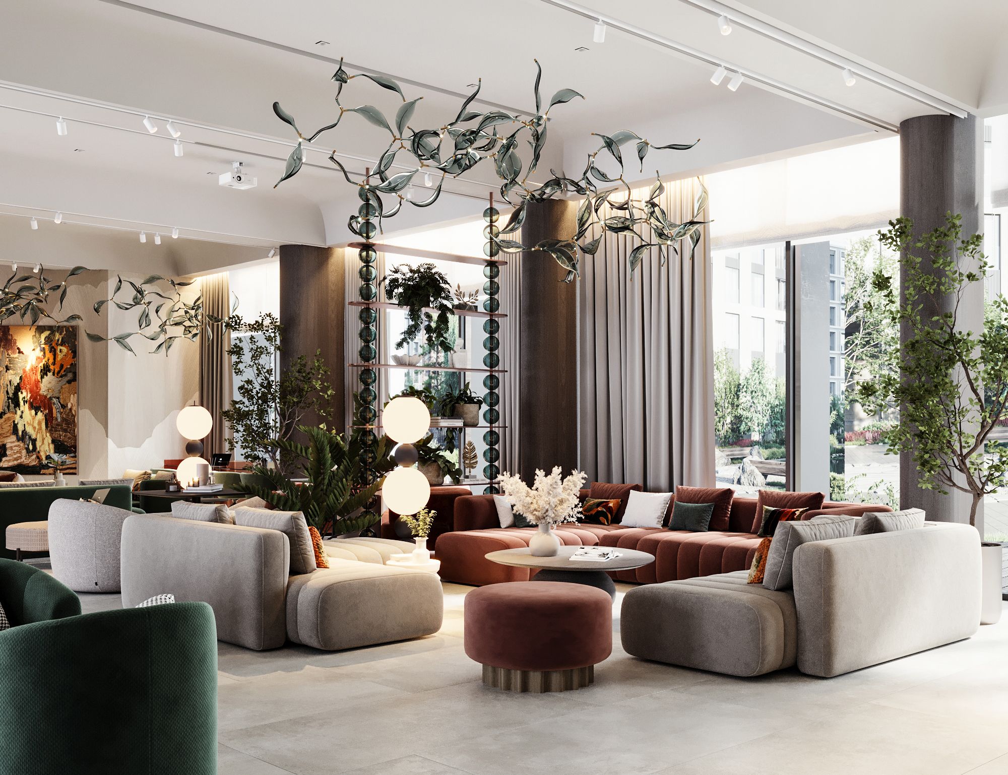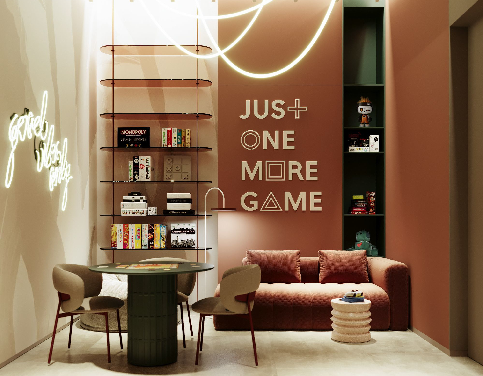 В квартале создана клубная гостиная площадью 315 кв. м — особое пространство для общения жителей по фирменному стандарту FRIEND’S LAB от Sminex.